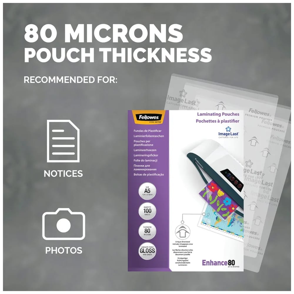 Bolsas de plastificação A5 transparentes e brilhantes, com 80 microns, em embalagem de 100 unidades.